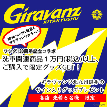 洗車関連商品10,000円以上ご購入いただいた先着6名様に、ギラヴァンツ北九州の選手サイン入りグッズをプレゼントいたします。