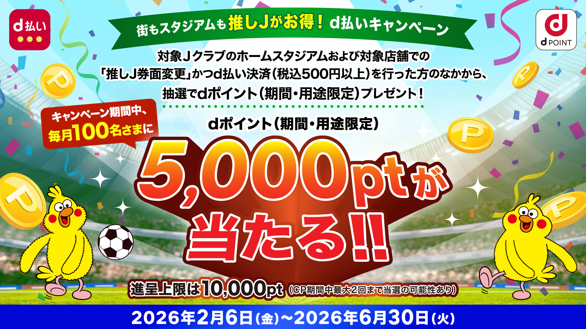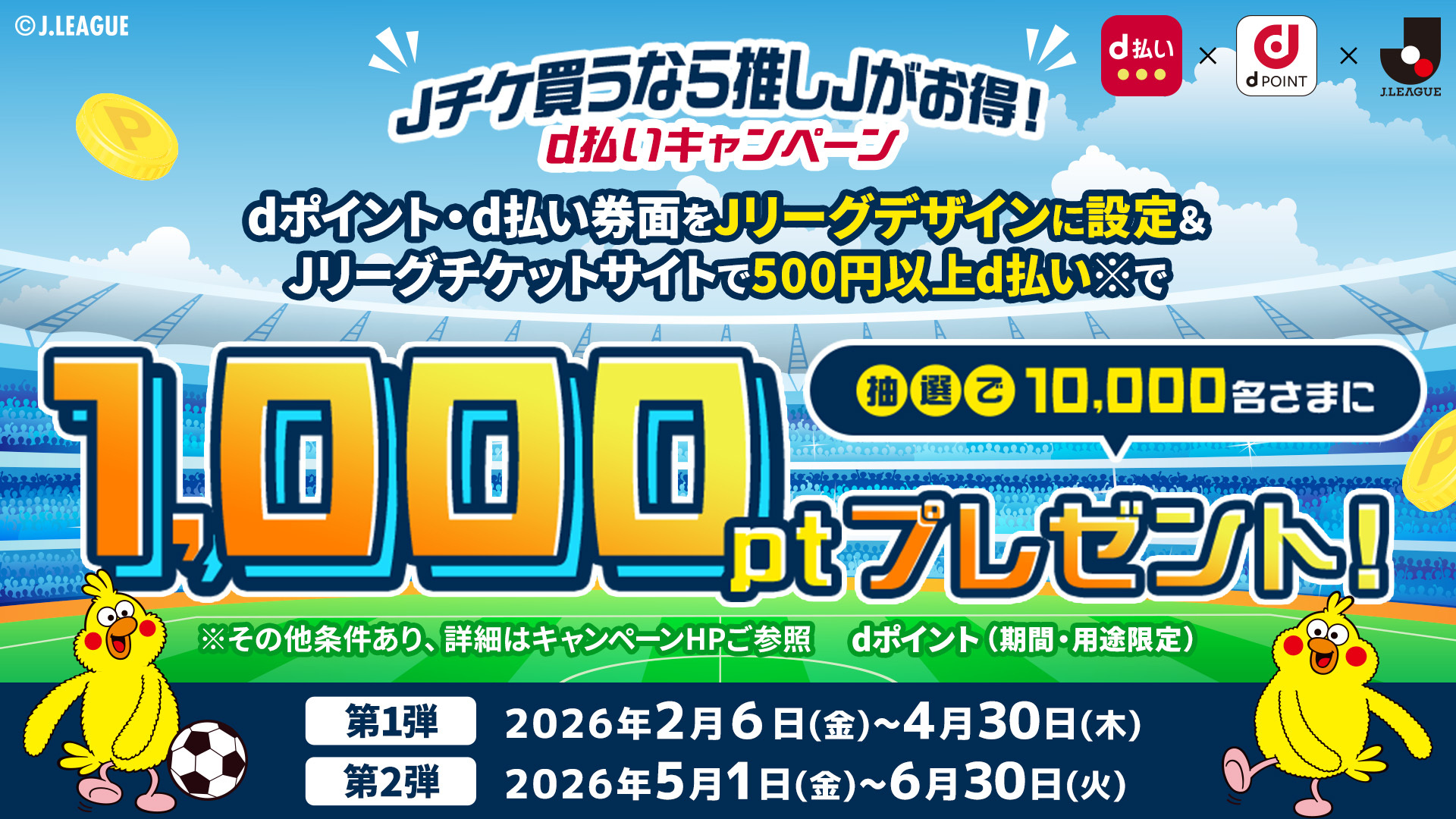 クラブパートナーのNTTドコモ様と連携して2つのキャンペーン(「Jチケを買うなら推しJがお得!d払いキャンペーン」と「街もスタジアムも推しJがお得!d払いキャンペーン」)を、2026年6月30日(火)までの期間で開催します。