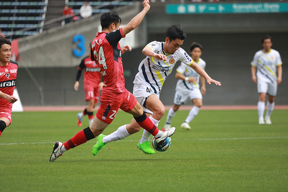 A:熊本さんは3-4-3のような形でアンカー化しながらずれを作ってきていましたが、3バックだとウィングバックがいるので、我々は逆サイドをある程度捨てる守備になります。逆サイドを捨てている状況なのに同サイドから簡単に展開されてしまう現状が続いています。最後の守備の甘さ、そしてJリーグの基準の変化への対応も必要です。サイドハーフが逆サイドを埋めて欲しいという話もしていましたが、ハーフバックに矢印を出しすぎてギャップを突かれる場面もありました。徐々にボールを持たれる時間が長くなり、自分たちがボールを保持する時間帯をなかなか作れず足も頭も止まってきた中で、4枚のスライドが遅れだしてサイドを取られる状況が出てきました。真横ではなくて斜め後ろにスライドすることなどで解決できる可能性もあると思います。いろいろ試してきた中で何を今出すべきか、本当にボタンがカチッとはまればいけるのではないかと思います。