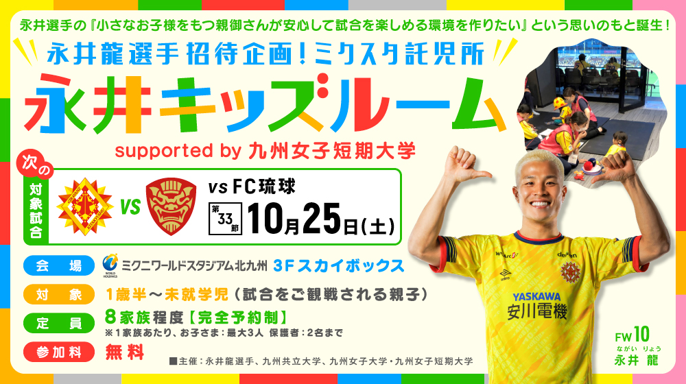 【10/25vs.琉球/ホームゲーム】永井龍選手 招待企画『永井キッズルーム supported by 九州女子短期大学』参加者募集