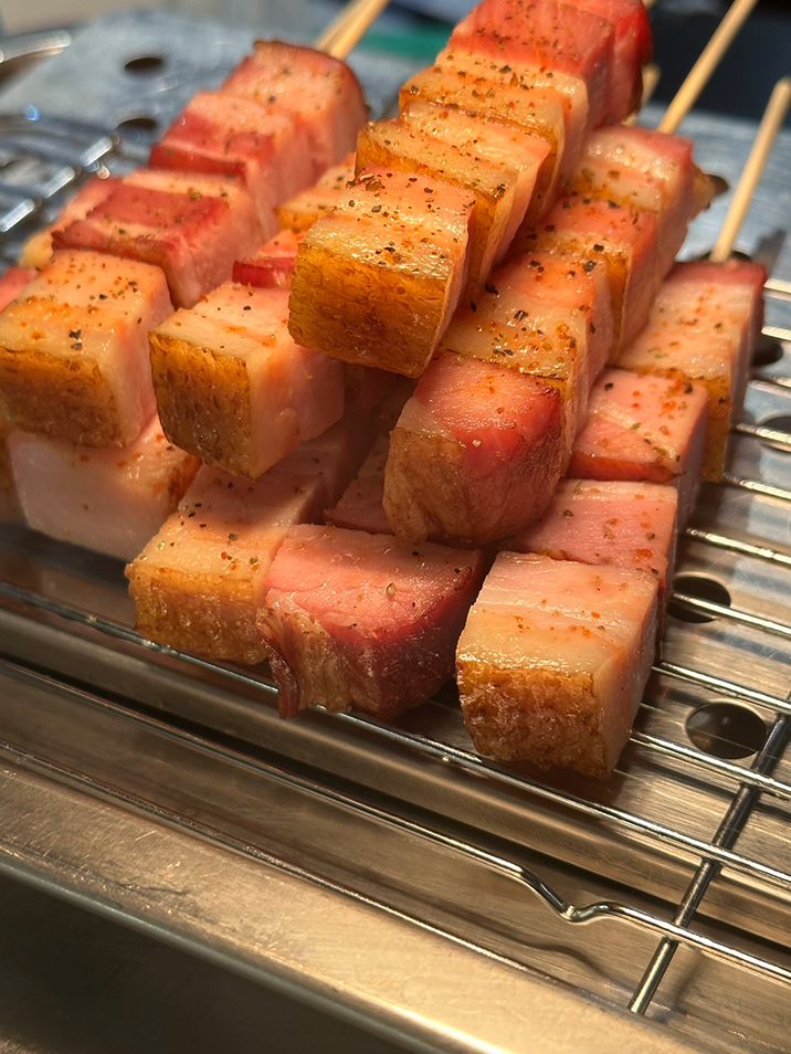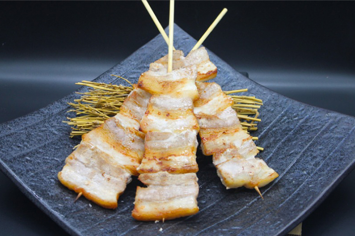 自社製品の大きなダブルスモークベーコンを串に刺して香ばしく焼きあげたもの。ビールとの相性抜群です!