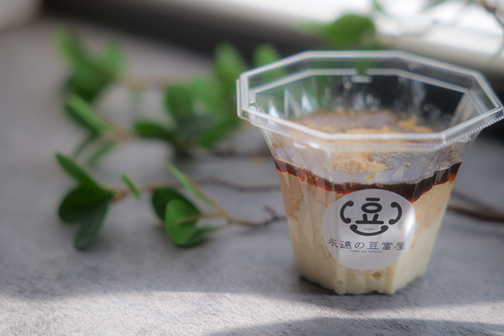 豆富屋の大人気「とわとろ豆富」に、沖縄黒蜜と香ばしいきなこをたっぷり。ふわっととろける食感と優しい甘さがクセになる…心とろける贅沢スイーツ♪