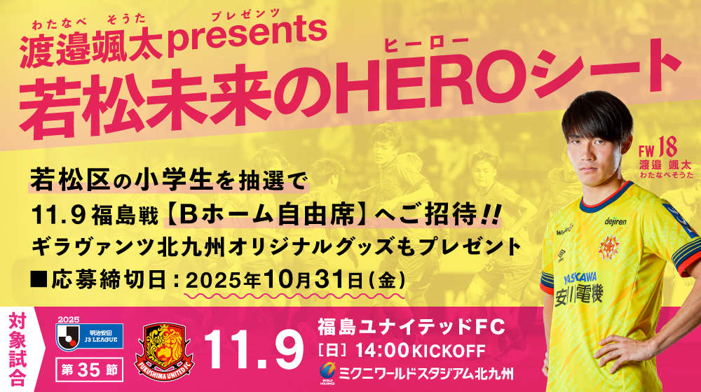 ギラヴァンツ北九州背番号18番 渡邉颯太 選手がホームゲームにご招待する企画「若松未来のHEROシート」!