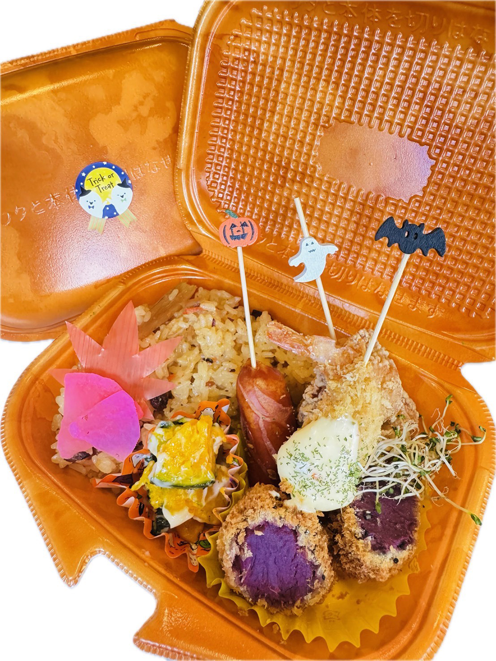 ハロウィン弁当1,000円(かしわめし、唐揚げ、エビフライ、紫芋コロッケ、カボチャサラダ、ウインナー)