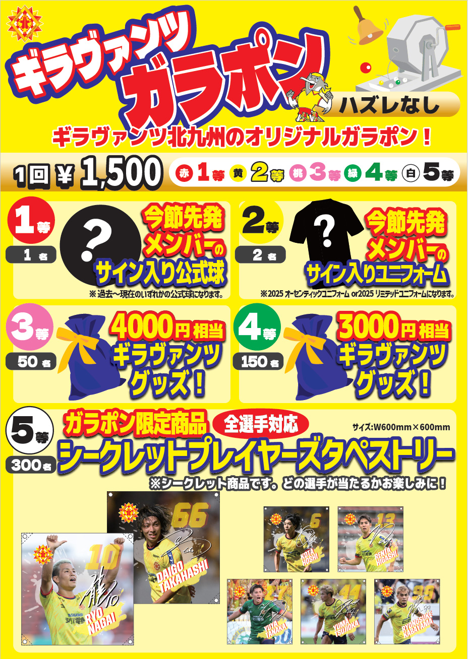 福島戦(11月9日(日))にスタジアムにて、ハズレ無しのグッズイベント「ガラポン」を今節も実施致します。今節は販売価格が上がりますがその分景品もグレードアップしました。是非ブースにお立ち寄りください。