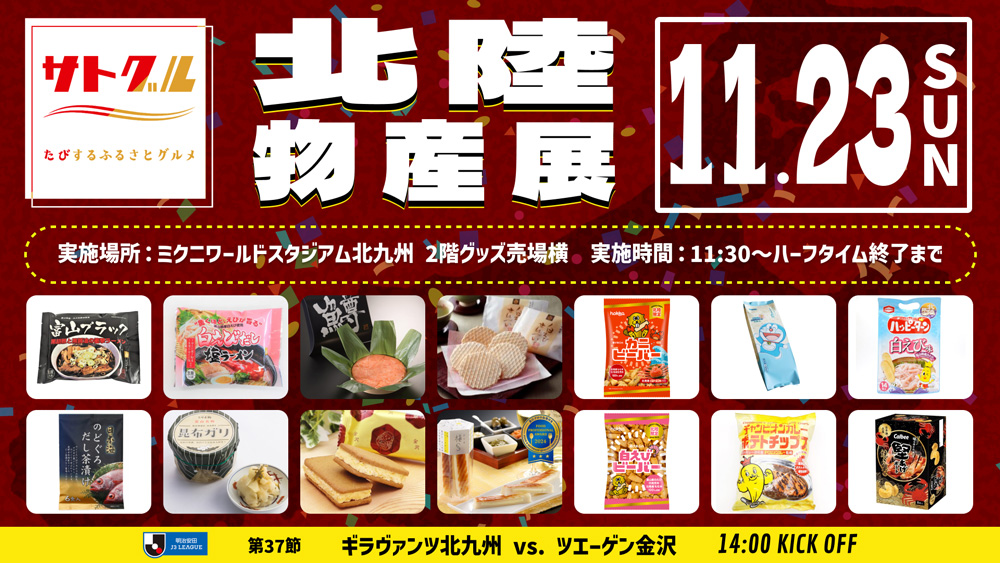 11月23日(日)に開催されるギラヴァンツ北九州今シーズン最後のホームゲーム(2025明治安田J3リーグ 第37節 ギラヴァンツ北九州vs.ツエーゲン金沢)にて、「サトグル~たびするふるさとグルメ~【北陸物産展】」の出店が決定いたしましたので下記の通りご案内いたします。