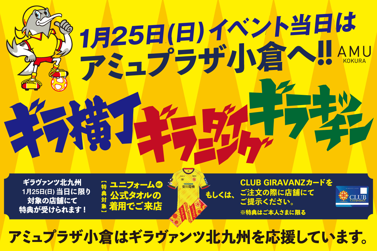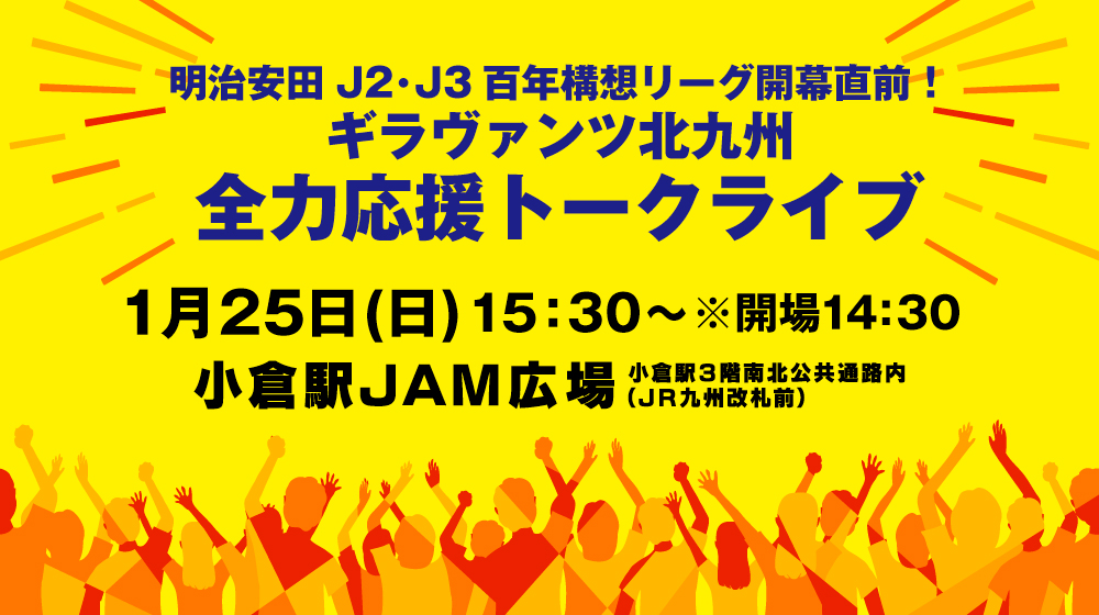 1月25日(日)15:30より「明治安田J2・J3百年構想リーグ開幕直前!ギラヴァンツ北九州全力応援トークライブ」を小倉駅JAM広場にて開催することが決定いたしましたので、お知らせいたします。