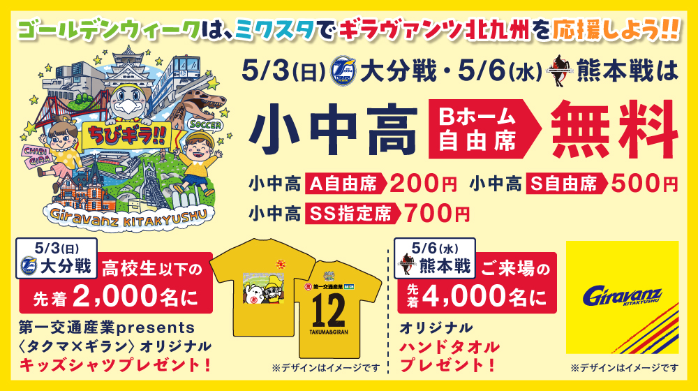 今年も「ちびギラ」を開催いたします!今年は5月3日(日)14:00キックオフの大分トリニータ戦、5月6日(水)14:00キックオフのロアッソ熊本戦の2試合が対象にパワーアップ!