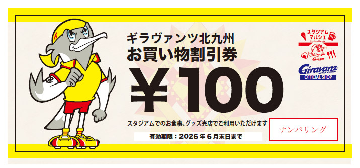 ③2か所のスタンプをGETした方はミクニワールドスタジアム内(2階グッズうりば前)のブースでスタンプを提示いただくと、先着1,000名さまにミクニワールドスタジアム北九州内のスタジアムマルシェ・グッズうりばでご利用いただける「お買い物割引券(100円分)」をプレゼント!
