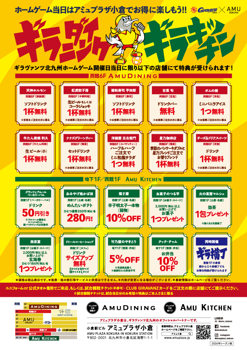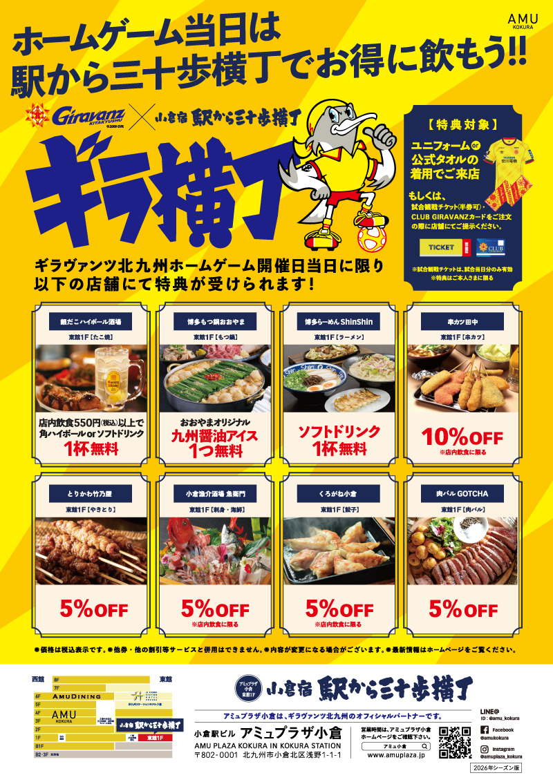 明治安田J2・J3百年構想リーグ、ギラヴァンツ北九州のオフィシャルパートナーである株式会社JR小倉シティ様(本社:福岡県北九州市、代表取締役社長:中村勇)が運営するアミュプラザ小倉では、ギラヴァンツ北九州との連携企画「ギラ横丁・ギラダイニング・ギラキッチン」を開催されます。様々な特典をご用意いたしておりますのでぜひご来店ください。