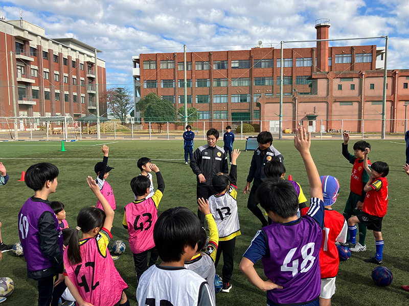 当日は、九州共立大学サッカー部の学生にも補助コーチとして参加いただき、子どもたちと一緒に楽しい時間を過ごすことができました。
