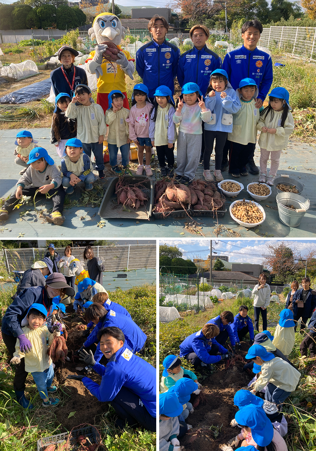 収穫には、ギラヴァンツ北九州トップチームの坪郷選手・木實選手・吉原選手が参加して、交流を深めながら楽しく収穫をしました。