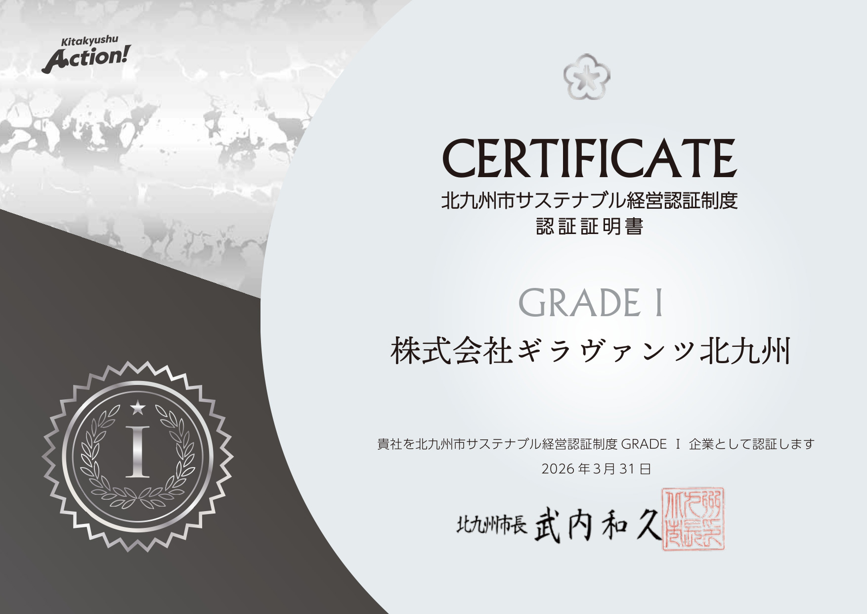 この度、株式会社ギラヴァンツ北九州は、北九州市が構築した「北九州市サステナブル経営認証制度」において、「Grade 1」の認証を取得いたしましたことをご報告申し上げます。