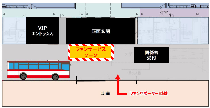 ・バス入り待ちエリアは、スタジアム正面入口付近(図参照)となりますので、指定した時間内でご利用ください。