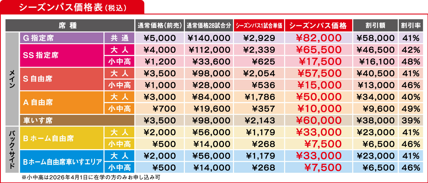尚、車いす席、Bホーム自由席車いすエリアのシーズンパスは障がい者割引の対象外となります。ご注意ください。