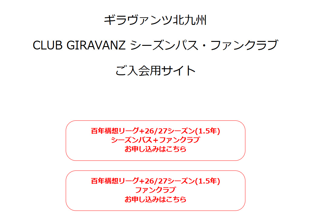 ①シーズンパスをご購入の方は「シーズンパス+ファンクラブお申し込みはこちら」から、ファンクラブにご入会の方は「ファンクラブお申し込みはこちら」から、それぞれお進みください。