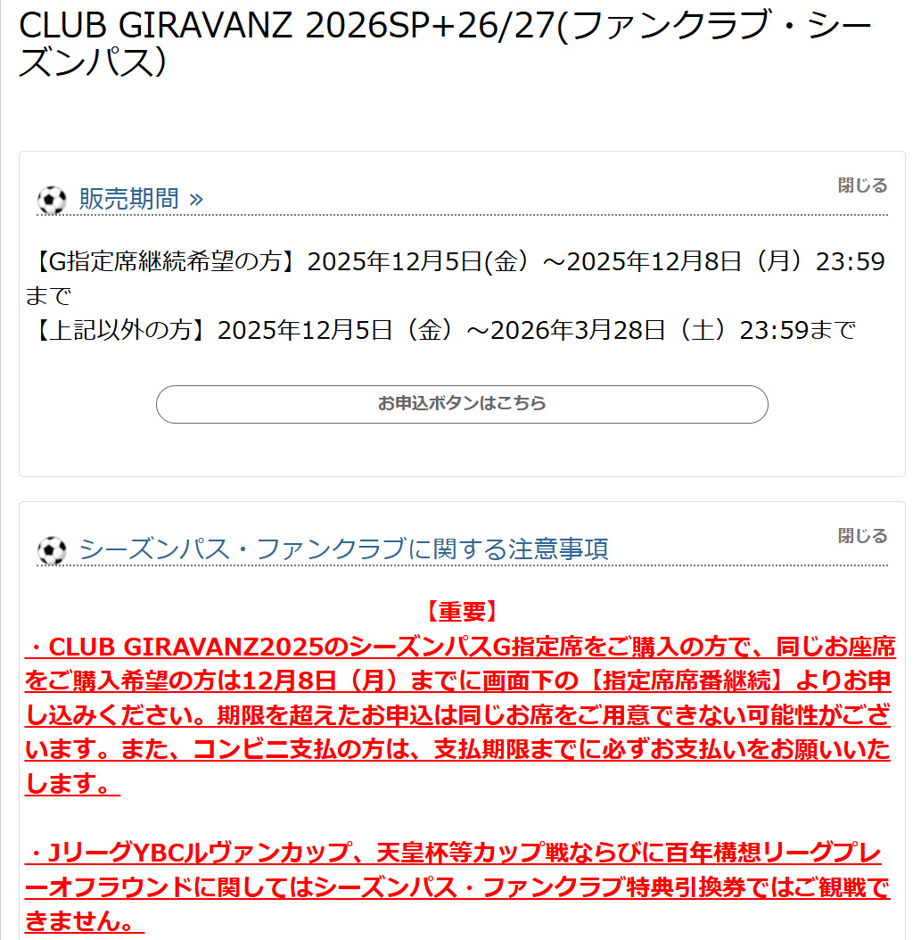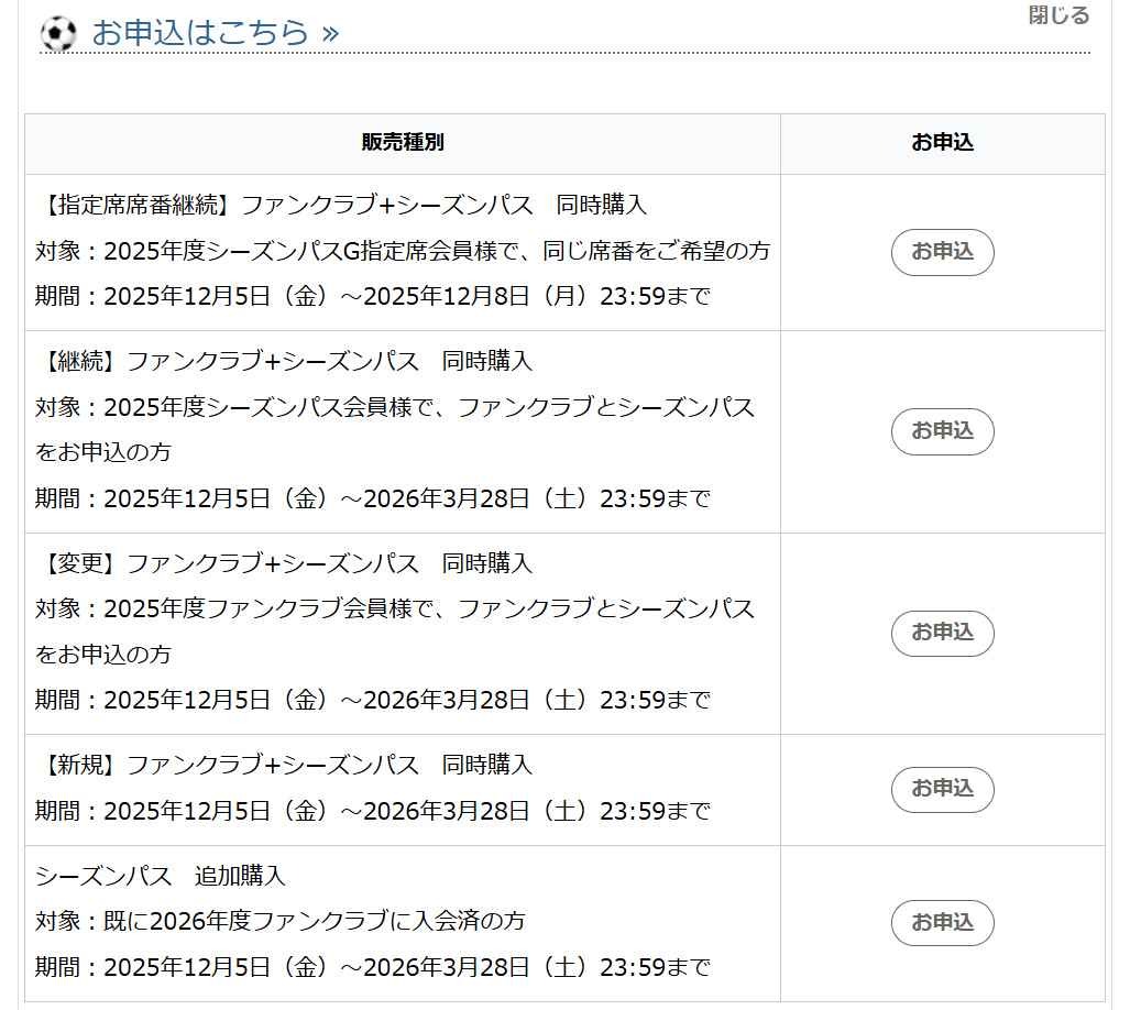 ③「指定席席番継続(2025シーズンにG指定席シーズンパスをご購入の方で、来季も同席番をご購入希望の方)」、 「継続(2025シーズンにシーズンパスをご購入の方で、来季もシーズンパスをご購入の方)」、「変更(2025シーズンにファンクラブにご入会の方で、来季はシーズンパスをご購入の方)」、「新規(2025シーズンにいずれも未入会の方で、来季はシーズンパスをご購入の方)」、「シーズンパス追加購入(既に来季のファンクラブに入会済みで、シーズンパスのみを追加購入される方」 それぞれ入口が異なりますので、ご自身の状態をご確認頂き、各入口よりお進みください。