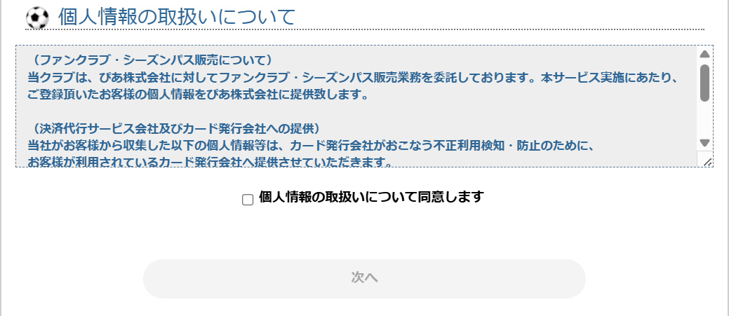 ⑤個人情報の取扱いについてご確認頂き、同意ボタンにチェックの上、「次へ」でお進みください。