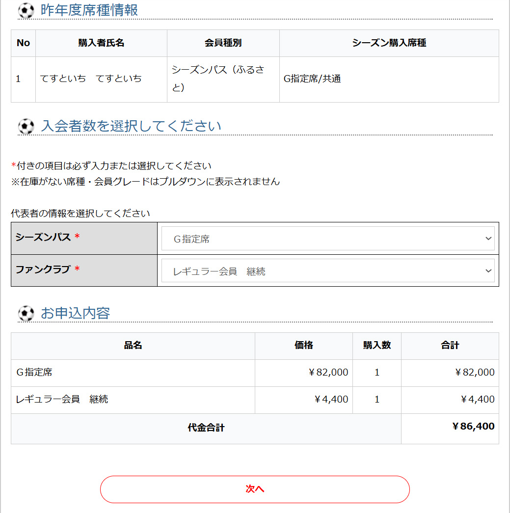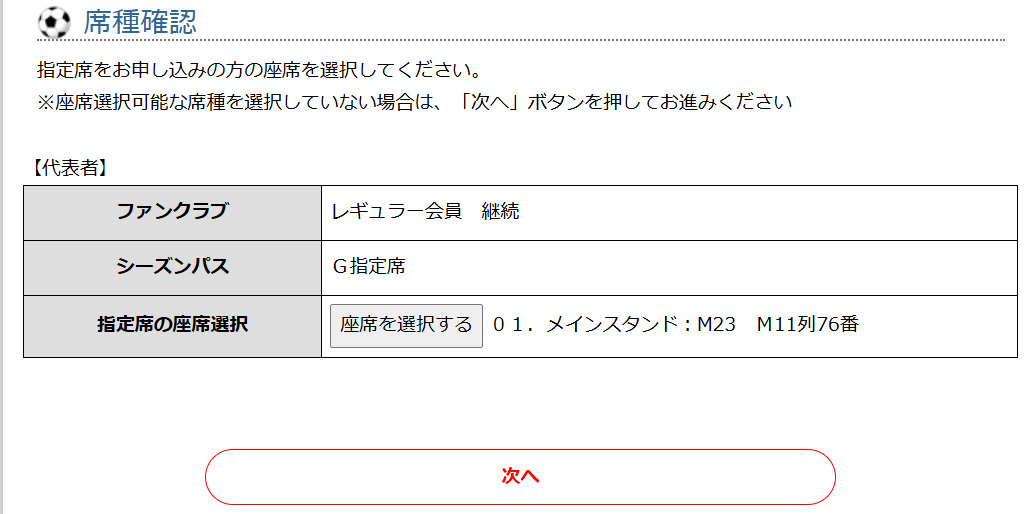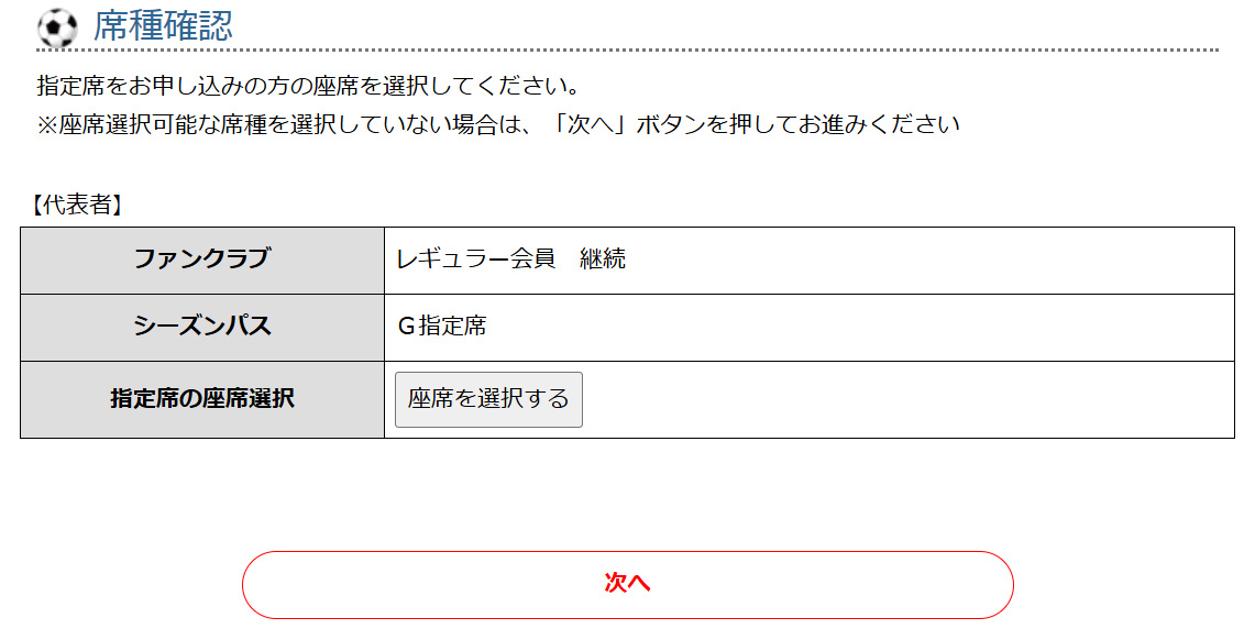 ⑥ご希望のシーズンパス席種、ファンクラブコースをご選択の上、「次へ」でお進みください。