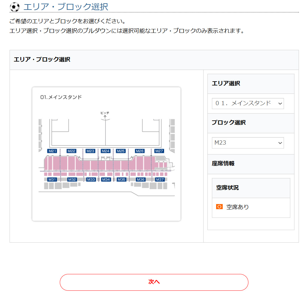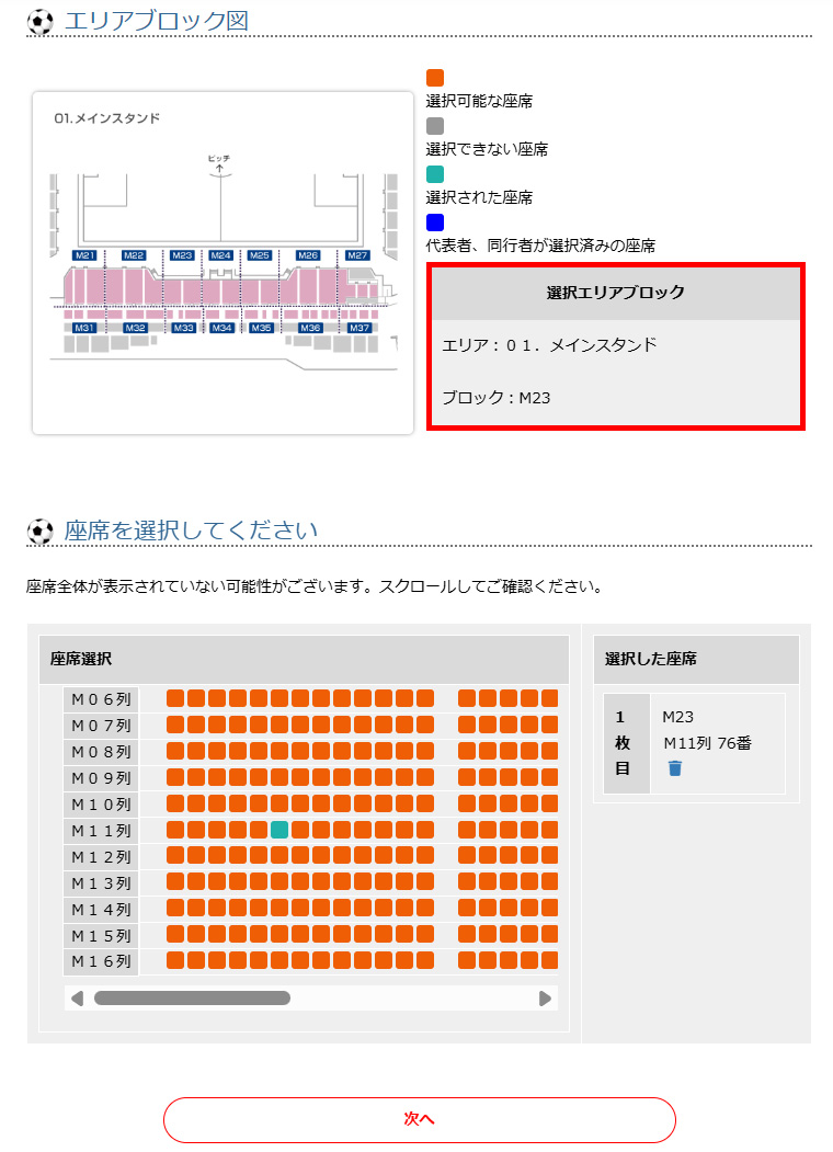 ⑩ブロック内でご選択いただける席が表示されますので、ご選択の上、次へでお進みください。