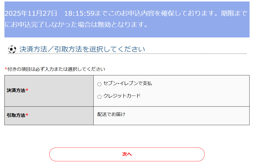 ⑬お申込内容、決済方法、ご入力個人情報、利用規約をご確認頂き、利用規約に同意を頂き、お申込をお進みいただくと完了となります。JリーグIDでご登録頂いたメールアドレスに購入メールが届きますので、内容をご確認ください。また、コンビニ支払をご選択の方は、「払込票番号」が記載されておりますので、支払期限までに払込票番号を持参の上、コンビニエンスストアにてお支払いください。尚、期限までのお支払いが確認できなかった場合、キャンセル(指定席ご選択の方は、ご選択いただいた席に関してもキャンセル)となりますので、ご注意ください。