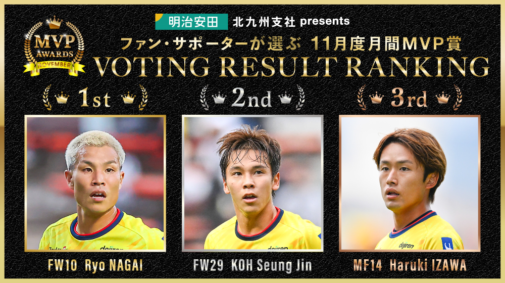 ファン・サポーターの皆さまの投票により、「ギラヴァンツ月間MVP賞」の11月度受賞選手が「永井龍選手」に決定いたしました。 たくさんのご投票ありがとうございました。