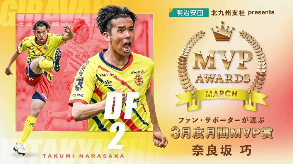 ファン・サポーターの皆さまの投票により、「ギラヴァンツ月間MVP賞」の3月度受賞選手が「奈良坂巧選手」に決定いたしました。